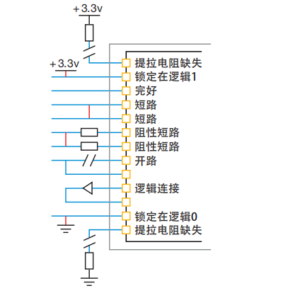 缺失的提拉电阻和固定故障也可以通过连接测试找到,还包括涉及可以用真值表描述其行为的逻辑设备的故障。