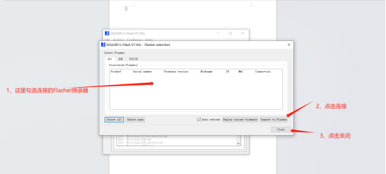 第五步:离线烧录,关闭U-Flash窗口,按Flasher烧录器上的按钮进行烧录,绿灯亮而红灯不亮代表烧录成功。