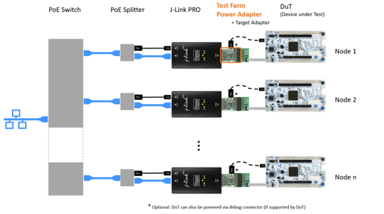 每个节点包含一个SEGGER J-Link PRO调试器,它在目标端通过SEGGER test Farm电源适配器和SEGGER的许多目标适配器之一连接到被测设备(DuT)。