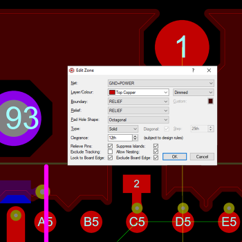 电源平面与其他物体之间的间隙是相关设计规则与在平面配置对话表中输入的默认间隙的较大值。这使得用户可以完全控制,因为他们可以通过特定区域的设计规则空间来覆盖平面的默认间隙。同一网中焊盘的默认连接类型(热连接、实体连接等)是为平面全局设置的,必要时可根据每个焊盘进行重设。
